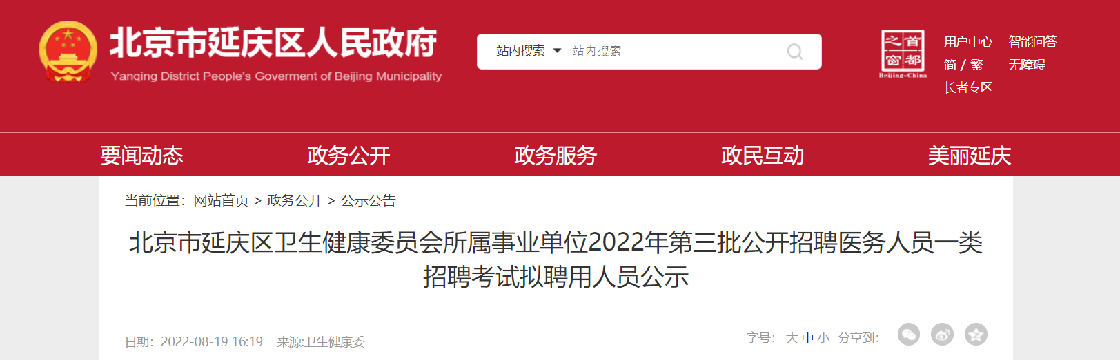 2022第三批北京市延慶區(qū)衛(wèi)生健康委員會(huì)所屬事業(yè)單位招聘考試擬聘用人員公示已發(fā)布。公示時(shí)間為2022年8月19日至8月29日。為您整理了以下內(nèi)容,供您參考。
