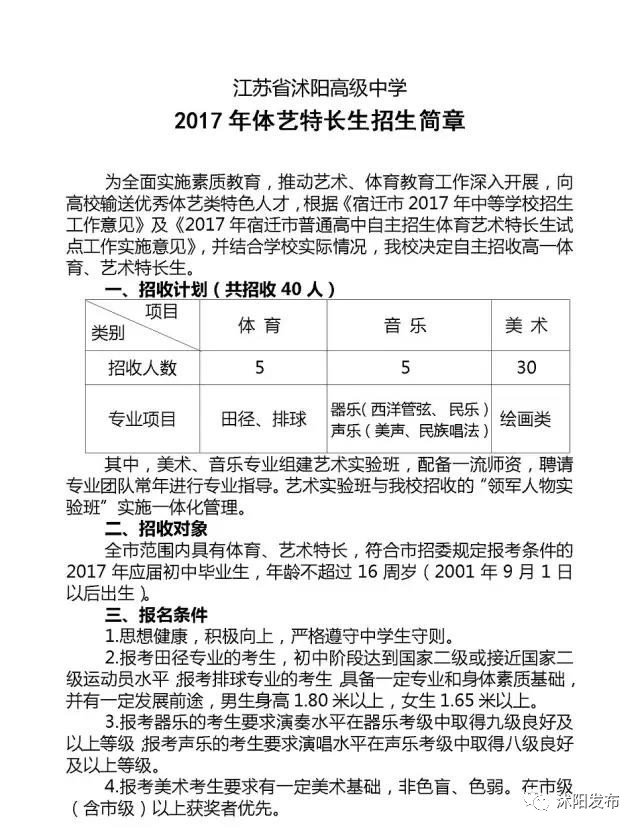 為全面實施素質教育,推動藝術、體育教育工作深入開展,向高校輸送優(yōu)秀體藝類特色人才,根據(jù)《宿遷市2017年中等學校招生工作意見》及《2017年宿遷市普通高中自主招生體育藝術特長生試點工作實施意見》,并結合學校實際情況,我校決定自主招收高一體育、藝術特長生。