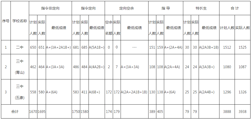 1.市二中計劃招生1512人,實際錄取1525人;市三中(青山校區(qū))計劃招生1080人,實際錄取1087人;市三中(五象校區(qū))計劃招生1296人,實際錄取1326人。實際錄取人數(shù)超過計劃招生人數(shù)的屬最后一名成績有并列所致。