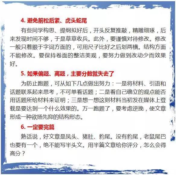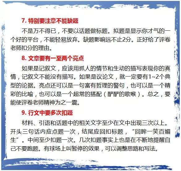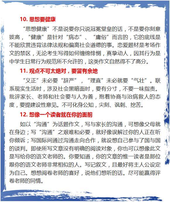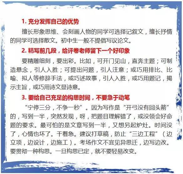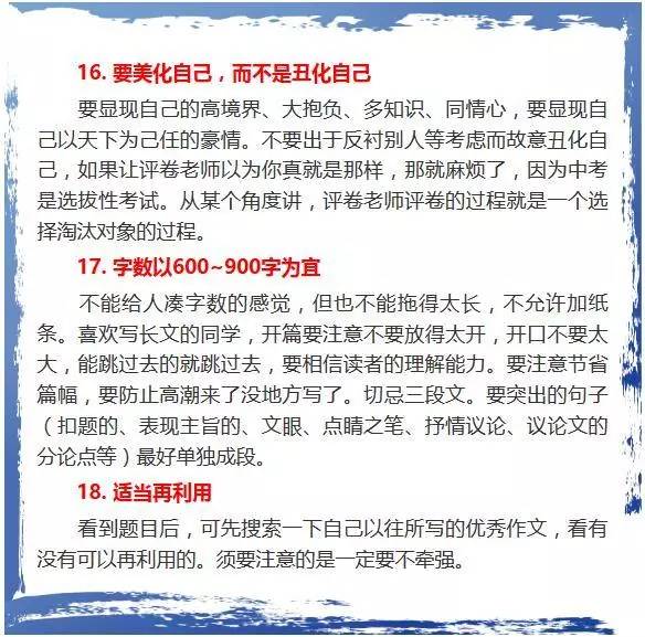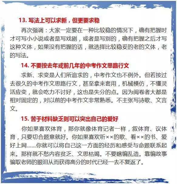 作文一直是語文考試的大項,占了語文總分的“半壁江山”,中考語文要想拿高分,就必須保證作文分數(shù)在55分左右,最起碼也得50+。然而,大部分同學的中考作文得分都在40左右,這是一個中規(guī)中矩的范圍。很多同學覺得自己文采不錯,可考場作文卻拿不到到高分,因此將它歸咎于應試焦急之錯;怪考場作文把題材限定的太死,阻礙了自己的創(chuàng)新??煽荚嚠吘故强荚嚕仨毎凑找惶讟藴实牧炕绦騺?。閱卷老師也終究不是考試機器,他們的作文水平一定比你強,孰好孰壞,一眼便知。所以也別抱怨老師有目無珠,沒有好好看你寫的作文,真金不怕火煉,試問真的對作文成竹在胸的人,何懼考場內(nèi)外之別?