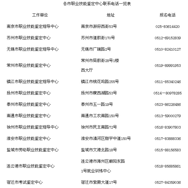 聯(lián)系地址:江蘇省職業(yè)技能鑒定中心 (南京市山西路68號頤和商廈4樓郵編210009)