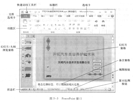 正在編輯演示文稿的PowerPoint窗口如圖5—3所示,可以看到,工作界面由快速訪問工具欄、標(biāo)題欄、選項卡、功能區(qū)、幻燈片/大綱瀏覽窗格、幻燈片窗格、備注窗格、狀態(tài)欄、視圖按鈕、顯示比例按鈕等部分組成。