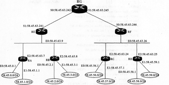 ④空是路由器RA的E0、E1對(duì)應(yīng)的58.45.0.0、58.45.1.0、和RB的E0、El端口58.45.2.0、58.45.3.0這4個(gè)網(wǎng)絡(luò)聚合得到的網(wǎng)絡(luò)號(hào)。
