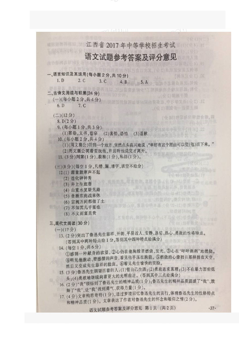 2017年江西景德鎮(zhèn)中考語文試卷及答案(已公布)