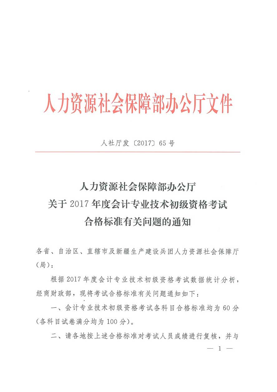 人力資源社會(huì)保障部辦公廳關(guān)于2017年度會(huì)計(jì)專業(yè)技術(shù)初級(jí)資格考試合格標(biāo)準(zhǔn)有關(guān)問題的通知