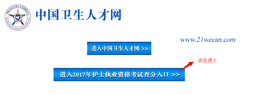 1、打開中國衛(wèi)生人才網(wǎng),點擊“進(jìn)入2017護(hù)士資格證考試查分入口”鏈接。