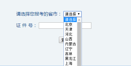 進(jìn)入成績查詢頁面后,按下圖所示,選擇報考的省市,輸入準(zhǔn)考證號或證件號,點擊查詢即可。