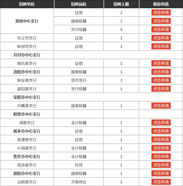 根據(jù)工作需要,經(jīng)中國人民銀行總行批準(zhǔn),中國人民銀行鄭州中心支行按照“公開公平、凡進(jìn)必考、競爭擇優(yōu)”的原則,決定面向社會(huì)公開招聘聘用制員工41名?,F(xiàn)將有關(guān)事項(xiàng)公告如下:
