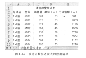 【例4-24】 現(xiàn)有如圖4—69所示的“銷售數(shù)量統(tǒng)計(jì)表”工作表中的數(shù)據(jù)清單,現(xiàn)建立數(shù)據(jù)透視表,顯示各分店各型號(hào)產(chǎn)品銷售量的和、總銷售額的和以及匯總信息。