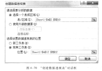(1)選擇“銷售數(shù)量統(tǒng)計(jì)表”數(shù)據(jù)清單的A2:El0數(shù)據(jù)區(qū)域,單擊“插入”選項(xiàng)卡下“表格”命令組的“數(shù)據(jù)透視表”命令,打開“創(chuàng)建數(shù)據(jù)透視表”對(duì)話框,如圖4—70所示。