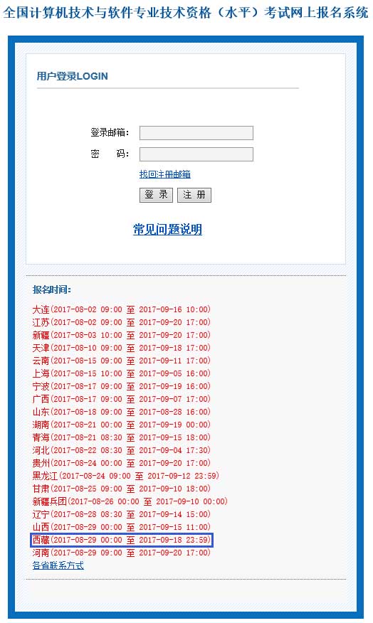 2017年11月西藏軟考報名時間在2017年8年29日00:00至2017年9年18日23:59期間,考生按照系統(tǒng)要求注冊、上傳照片、填寫并提交報考信息、網(wǎng)上繳納報考費用,確認報考費用繳納成功后,方完成全部報名手續(xù)。