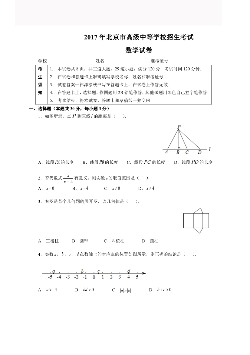 2017年北京豐臺中考數(shù)學(xué)試卷及答案(已公布)