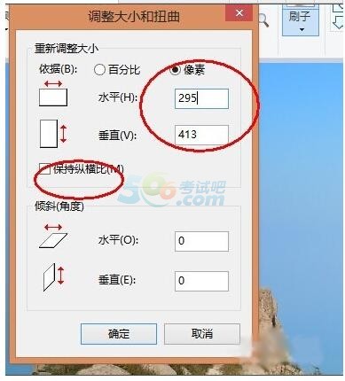 3、在對(duì)話框中,選擇“像素”選項(xiàng),將保持縱橫比前的鉤去掉,填入所需要的像素。證書申請(qǐng)照片像素要求413*626px。