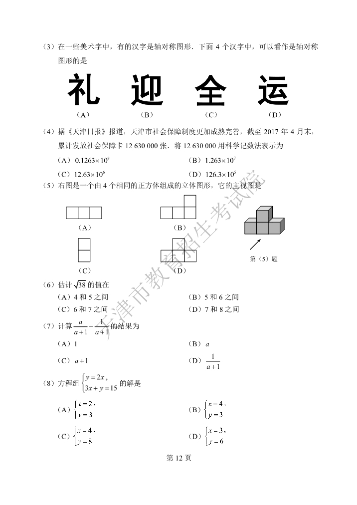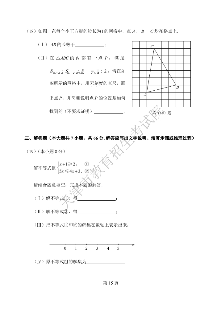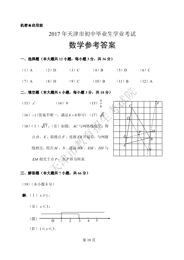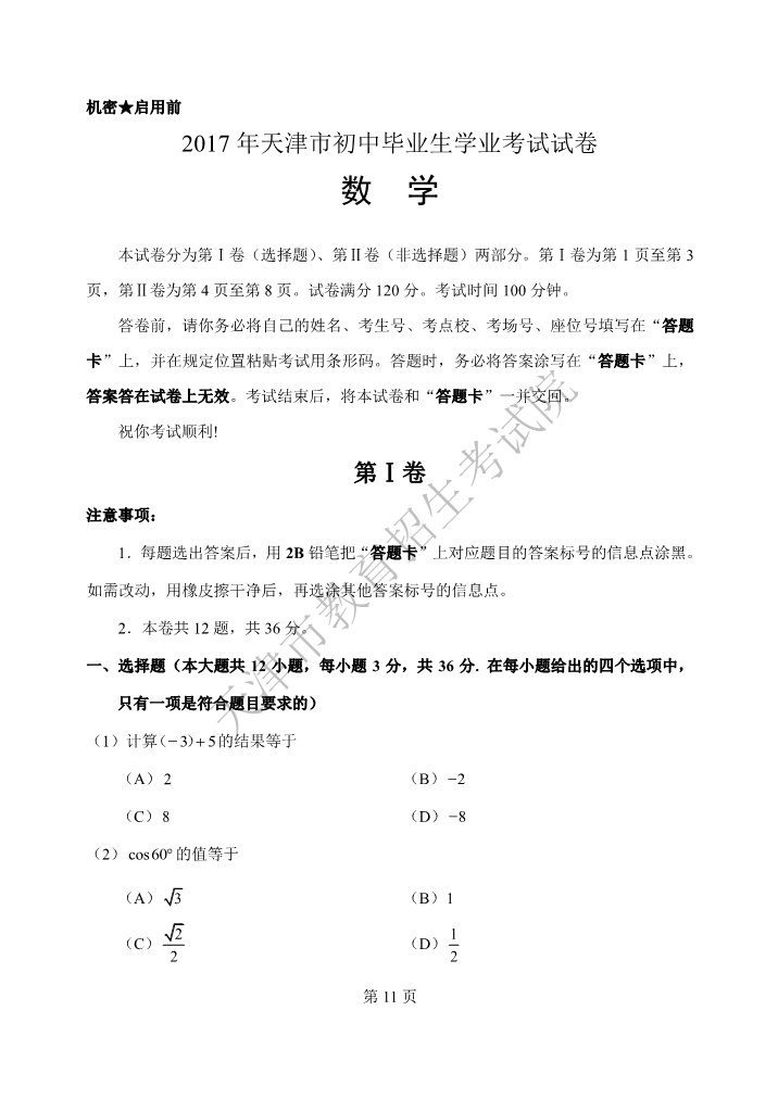 2017年天津南開中考數(shù)學(xué)試題及答案(已公布)