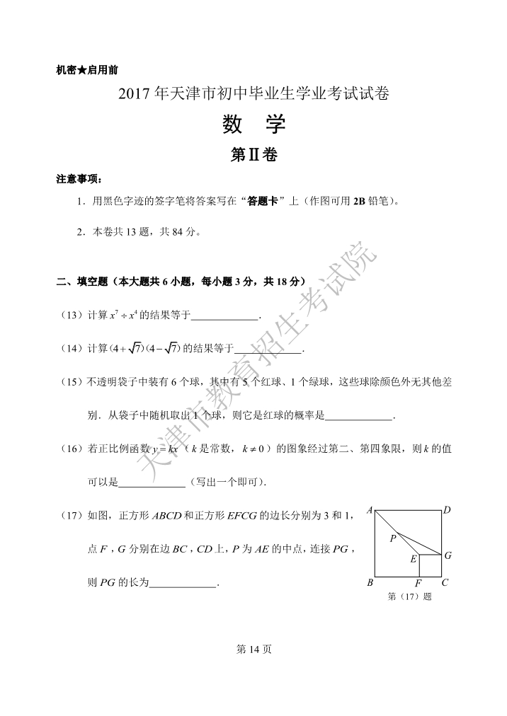 人生處處是考場,今日各為中考忙。斗智斗勇齊亮相,得失成敗走一場??紙鰹t灑不虛枉,多年以后話滄桑!2017年天津南開中考數(shù)學(xué)科目考試已落下帷幕,在考后第一時間提供天津南開中考數(shù)學(xué)試題及答案解析,供廣大考生參考估分。預(yù)祝各位考生取得優(yōu)異的成績,順利考入理想的高中!