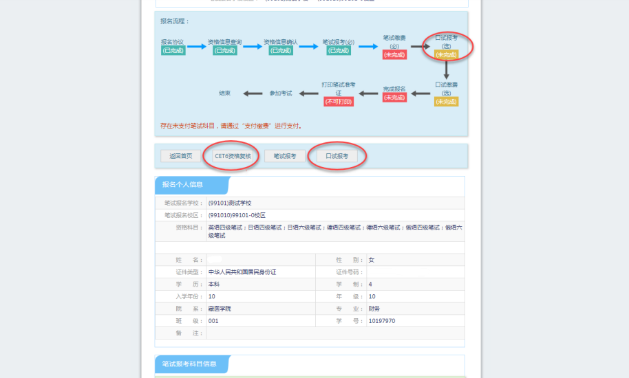 可看到報(bào)名流程的進(jìn)度:已完成筆試報(bào)考,可直接在下方進(jìn)行繳費(fèi)。也可在頁面中間部分繼續(xù)選擇“口試報(bào)考”;或“CET6資格復(fù)核”: