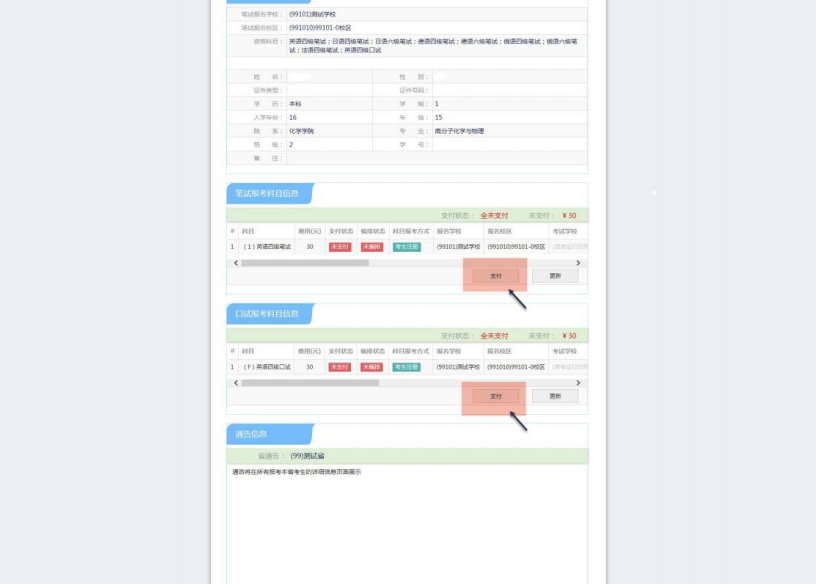 在頁面下方查看筆試及口試科目信息,無誤后點(diǎn)擊“支付”: