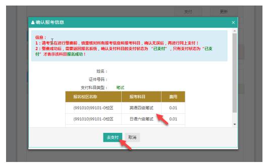 22、頁面提示確認(rèn)報(bào)考信息,點(diǎn)擊“去支付”,再次提示確認(rèn)報(bào)考信息,點(diǎn)擊“確定”