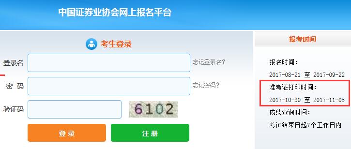 由中國證券業(yè)協(xié)會網(wǎng)站報名系統(tǒng)得知,2017年11月4日至5日證券從業(yè)資格考試準(zhǔn)考證打印時間為2017年10月30日-11月5日,具體截圖如下: