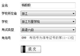 3、輸入姓名全名,選擇省市、學(xué)校、考試類型,選填考場號。單擊“提交”按鈕查詢,如下示例