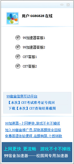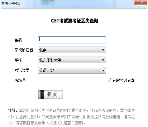 2、打開99宿舍客服軟件,單擊“2017年CET考試準(zhǔn)考證號丟失查詢”,彈出“準(zhǔn)考證找回”對話框。