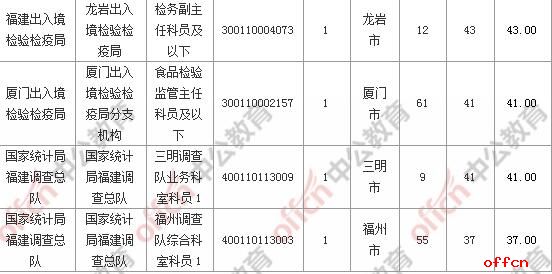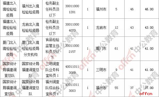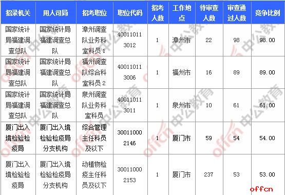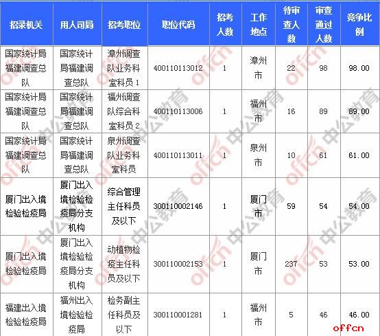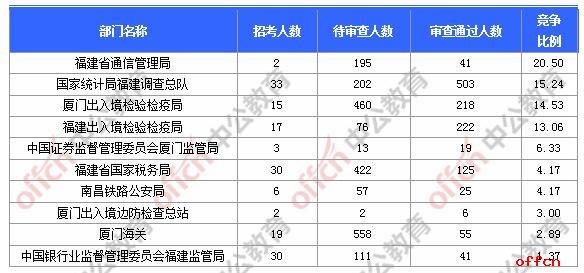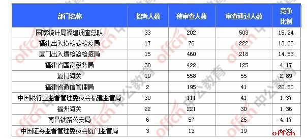 報名通過審核人數(shù)前十的職位主要集中在國家統(tǒng)計局福建調(diào)查總隊、廈門出入境檢驗檢疫局、福建出入境檢驗檢疫局等部門,具體信息如下: