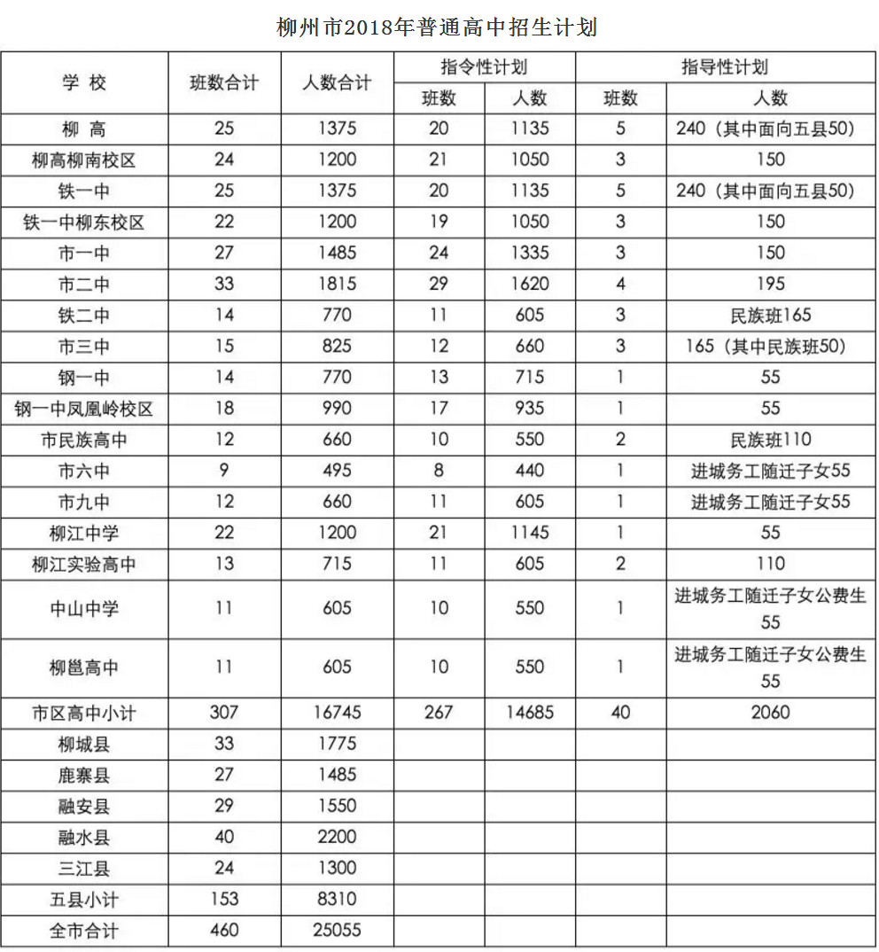 2018年,柳州市(含五縣)普通高中計(jì)劃招生460個班25055人,其中市區(qū)普通高中合計(jì)招生307個班16745人,五縣合計(jì)招生153個班8310人。