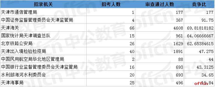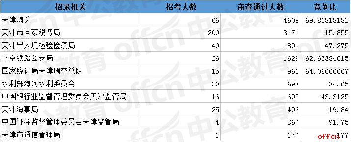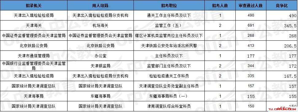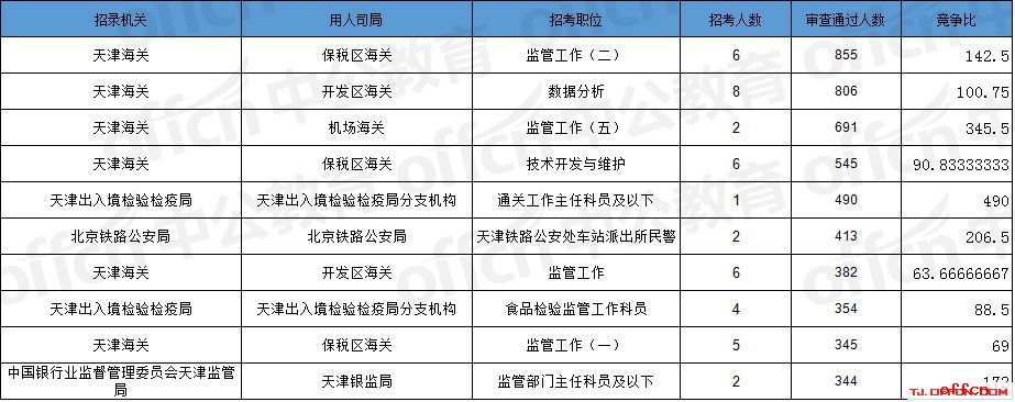 報(bào)名通過(guò)審核人數(shù)前十的職位主要集中在天津海關(guān)、北京鐵路公安局、天津出入境檢驗(yàn)檢疫局等部門(mén),具體信息如下: