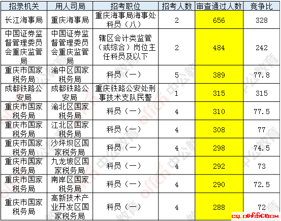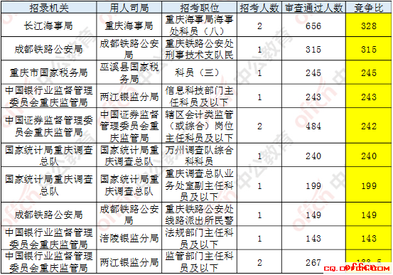 截止到8日17:30時,競爭比例的職位為長江海事局重慶海事局重慶海事局海事處科員(八)一職,招錄2人,截止到8日17:30時通過人數(shù)為656人。該職位雖然職位分布為西部地區(qū)和艱苦邊遠地區(qū)職位,屬于基層一線海事執(zhí)法,需經(jīng)常上船工作,但是仍是此次國考重慶地區(qū)競爭最激烈的崗位,專家估計,可能是由于其學歷限制為本科,對學位、政治面貌、服務基層項目工作經(jīng)歷無限制有關。該職位對基層工作最低年限有要求,為3年,說明報考該崗位的考生為已步入社會工作的人員。