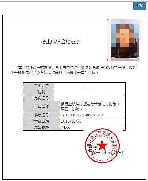 銀行從業(yè)成績(jī)合格證可以按照單科打印,成績(jī)合格證上將公示照片、姓名、證件號(hào)碼、考試時(shí)間、考試科目、準(zhǔn)考證號(hào)、成績(jī)分?jǐn)?shù)信息。