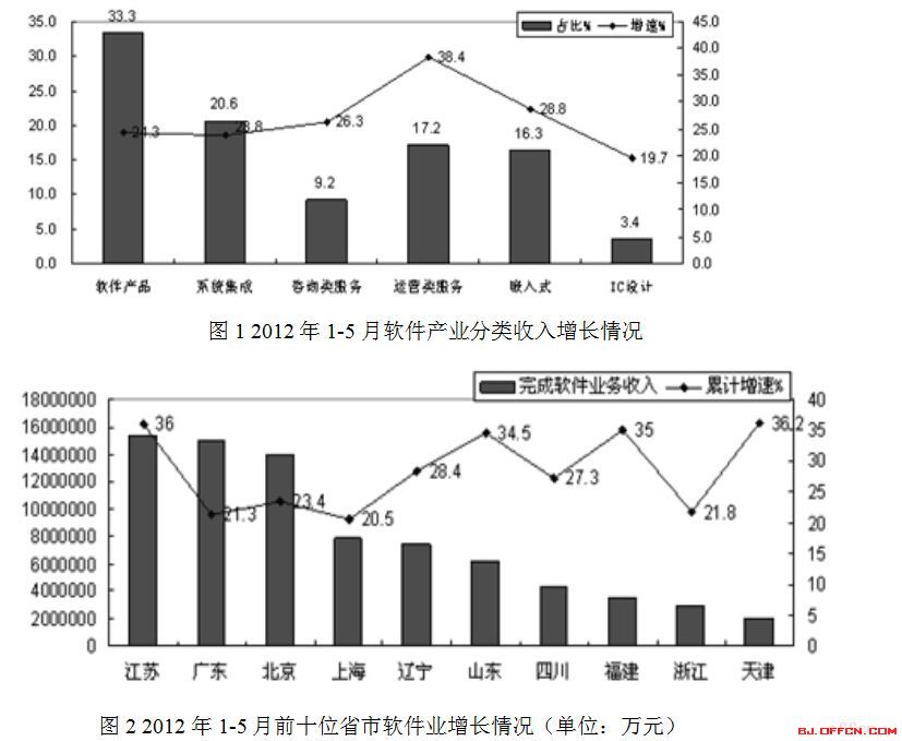 4.2012年1~5月江蘇完成軟件業(yè)務(wù)收入的增長率比上海高: