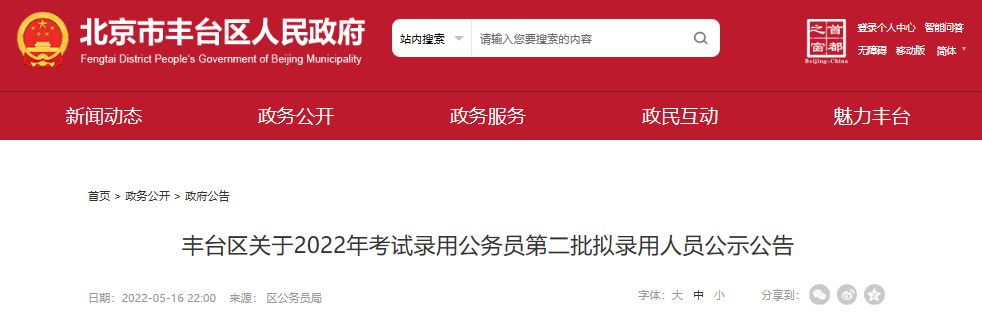 豐臺區(qū)關(guān)于2022年考試錄用公務員第二批擬錄用人員公示公告