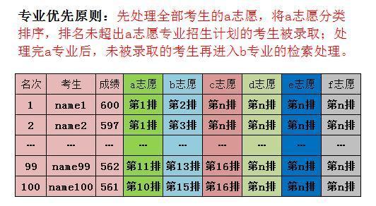 專業(yè)優(yōu)先是縱向一列一列地處理,先處理a專業(yè)志愿,某考生的a專業(yè)志愿沒錄上,則繼續(xù)處理下一個考生;第二輪處理b專業(yè)志愿時,錄取機率將比第一輪顯著降低。