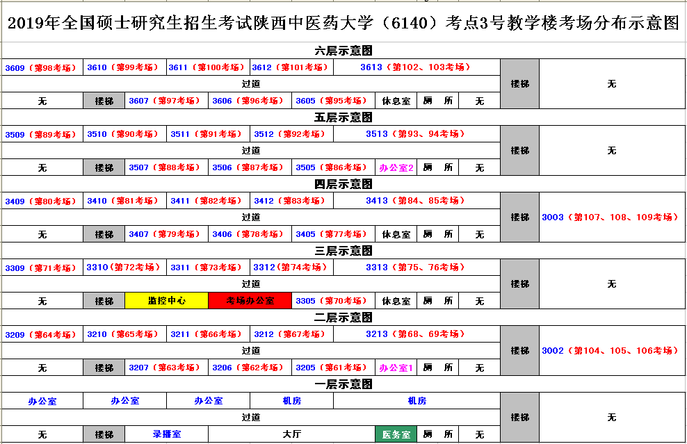 2018年全國(guó)碩士研究生招生考試陜西中醫(yī)藥大學(xué)(6140)考點(diǎn)3號(hào)教學(xué)樓考場(chǎng)分布示意圖