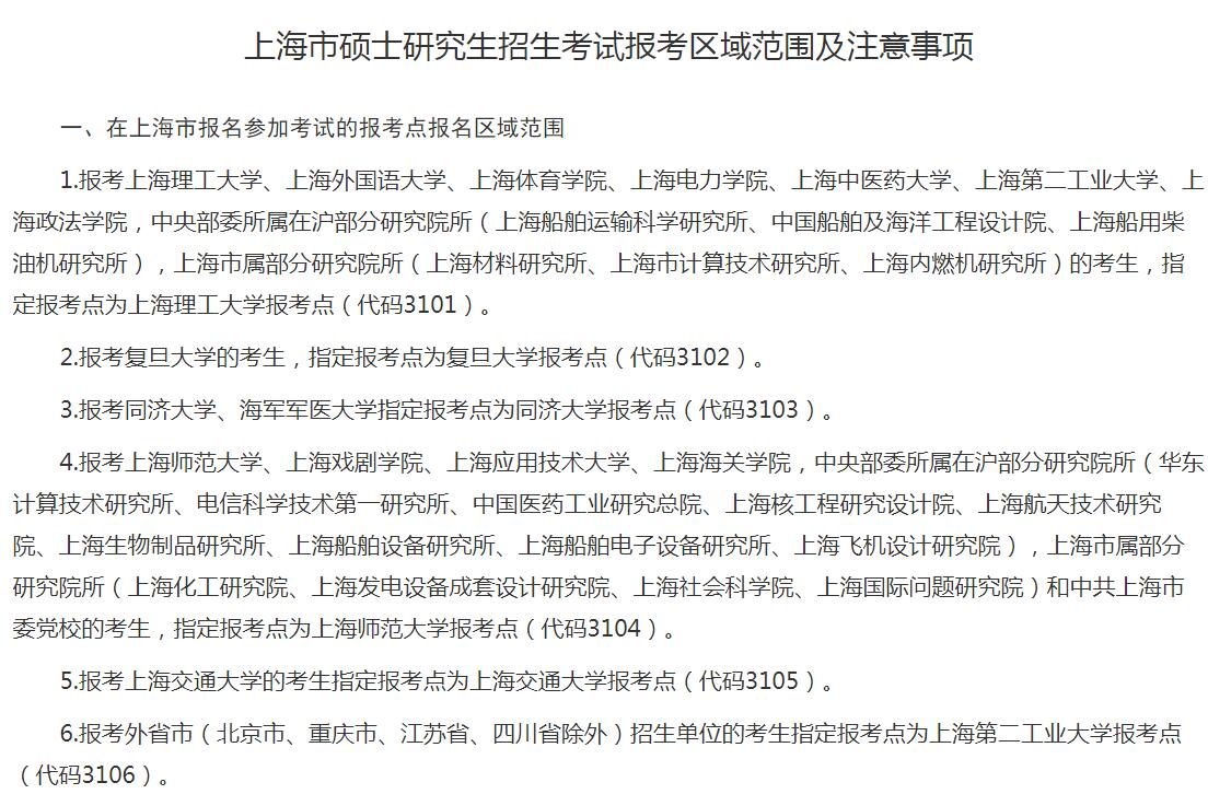 考研頻道從上海市教育考試院了解到,2019上海市碩士研究生招生考試報(bào)考區(qū)域范圍及注意事項(xiàng)已公布,具體如下: