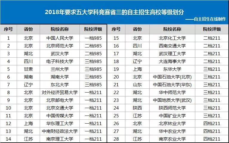 2018年全國共計38所高校對五大學(xué)科競賽要求省三,其中,10所僅面向本省招生。根據(jù)各校綜合實(shí)力情況,各校層次大致如下表,本文僅統(tǒng)計針對全國招生的院校。
