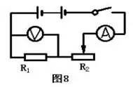例1 如圖8所示電路中,電源電壓不變,當滑動變阻器的滑片向右滑動時,電流表和電壓表的示數變化情況是[ B ]