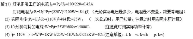 例1 "220V 100W"的燈泡正常工作時的電流是多少?若把這只燈泡接到110V的電源上,燈泡的實際電功率為多少?工作10分鐘消耗電能多少?1度電能讓它工作多少小時?