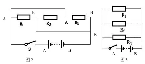 ⑵節(jié)點法:沒經過用電器,導線再長都相當于一個節(jié)點,觀察每個用電器兩端的端點確定它在電路中的位置。圖2、圖3是對各電阻的連接情況分析。