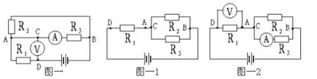 (4) 恢復明職責電流表電壓表復位。由電路圖一可知C、A兩點之間用導線連接在一起可看作同一點,電壓表的兩個接線柱分別連接D點和A點,所以電壓表是測量R1兩端的電壓。電流通過A點分開兩路,一路經過電流表后,再經過R3到達B點,所以電流表是測量通過R3的電流強度(如圖一2)。