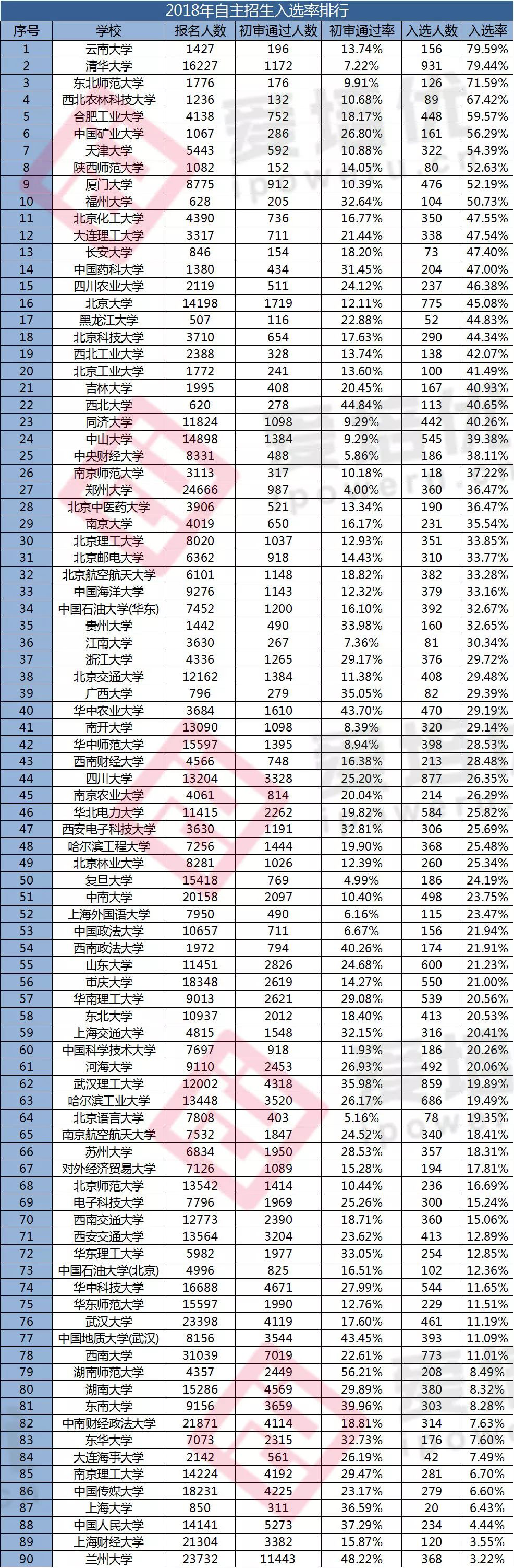 - 湖南師范大學(xué)、蘭州大學(xué)、中國人民大學(xué)、上海大學(xué)、東南大學(xué)四校,初審排前十,達(dá)35%以上,但是入選率極低,均低于10%。這就意味著,報名此五校的自主招生,通過初審相對不難,但想入選,獲得降分優(yōu)惠,你僅有不到10%的希望;