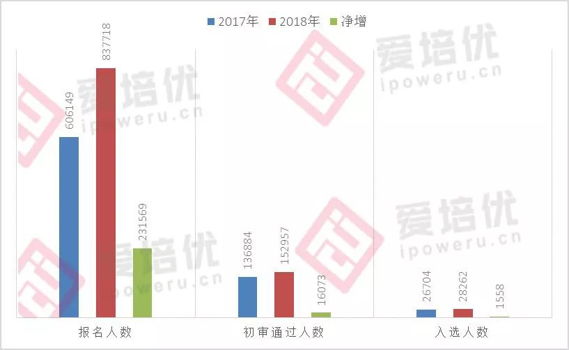2017年參加自主招生的共606149人,2018年增長了38.2%,共837718人報名;2017年通過初審共136884人,2018年增長了11.74%,共152957人;2017年最終入選人數(shù)為26704人,2018年增長了5.83%,共28262人。
