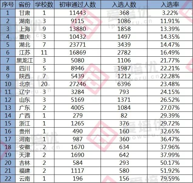 甘肅省就一所具有自主招生資格的院校,即蘭州大學(xué),故其入選率以蘭州大學(xué)為準(zhǔn),為3.22%,成為自主招生入選難度的省份;