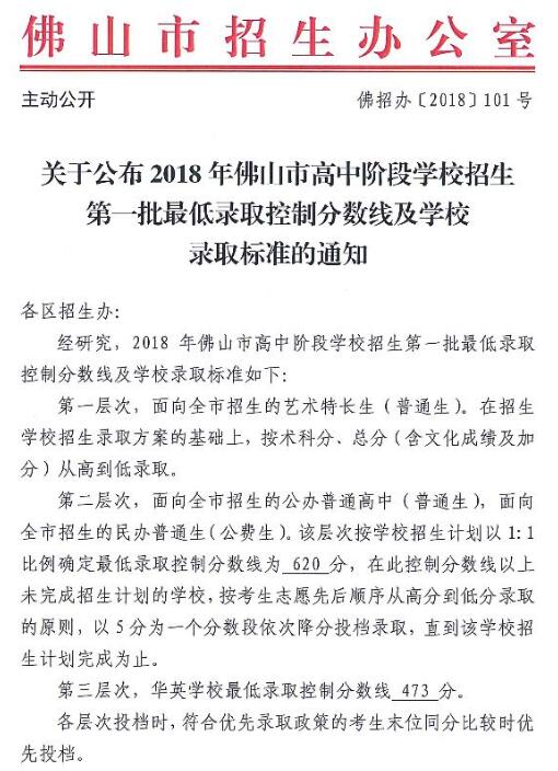2018年廣東佛山中考第一批錄取分?jǐn)?shù)線(已公布)