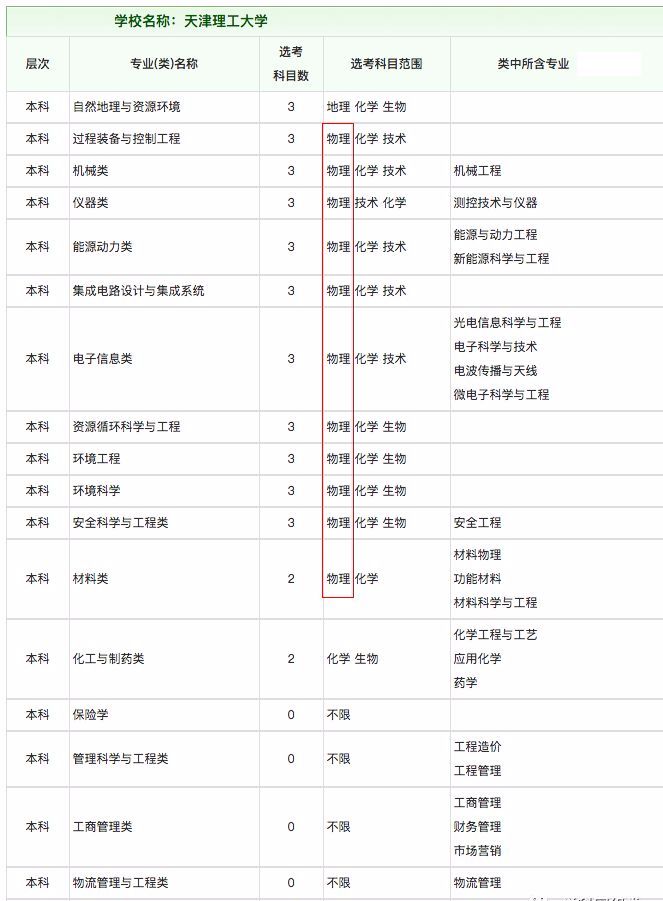 一所典型工科院校各專業(yè)對(duì)選考科目的要求