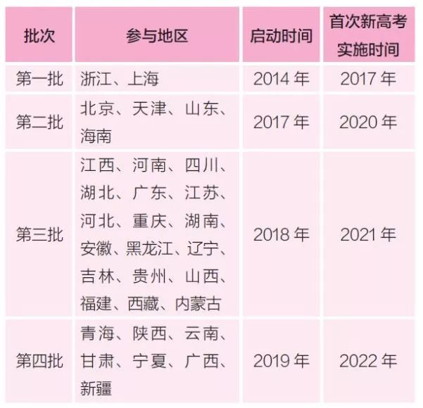 由于采用的是各地根據(jù)自身?xiàng)l件逐步參與施行的方式,所以不同地區(qū)的同學(xué)參與新高考的時(shí)間有所不同,具體可以參見上表。