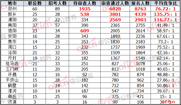 從河南省各個地市報名情況來看,截止到10月31日9時,報名人數(shù)最多、審查通過人數(shù)最多以及待審查人數(shù)最多的都是鄭州的職位,這也跟鄭州的職位數(shù)和招考人數(shù)最多有關(guān)。新鄉(xiāng)地區(qū)職位的平均競爭比,已達135.75:1。具體見下表。