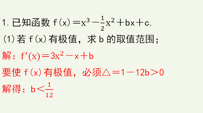 第1問分析:已知f(x)有極值,求參數(shù)的范圍,對于本題來說,導(dǎo)函數(shù)f'(x)是一個二次函數(shù),咱們在前面講過,只有當(dāng)二次函數(shù)與x軸有兩個交點時,f(x)才有極值,解題過程見下方: