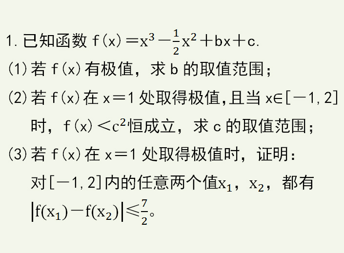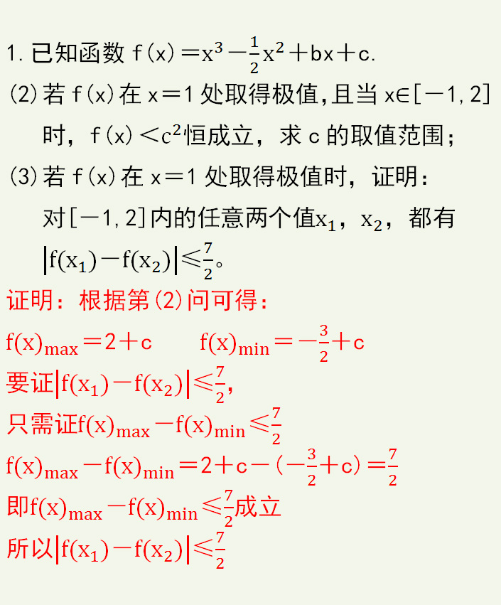 第3問分析:x₁和x₂是任意的兩個值,所以要證明不等式成立,只需證明f(x)的大值減去f(x)的小值≤7/2即可,證明如下: