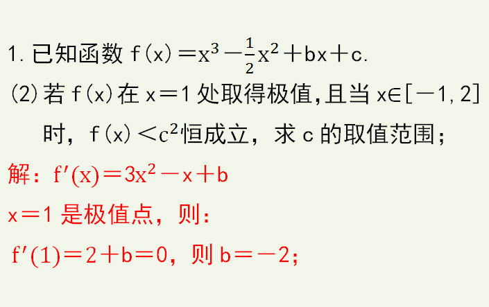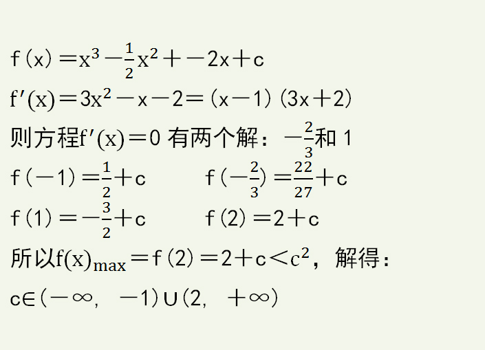 f(x)<c2恒成立,等價于:f(x)的大值<c2,則只需要求出f(x)的大值,然后令其<c2,解不等式,就可以求出c的范圍;求f(x)大值按照課本上所講一般分三步:第一步,求f(x)的單調(diào)區(qū)間;第二步,確定極值點;第三步,比較所有的極值點和定義域端點處的函數(shù)值的大小,大的就是大值。實際上有簡單做法:極值點都是方程f'(x)=0的解,所以可以不求單調(diào)區(qū)間,直接比較函數(shù)f(x)在方程f'(x)=0的解處和定義域端點處的函數(shù)值的大小即可,這樣做可以省掉很多步驟: